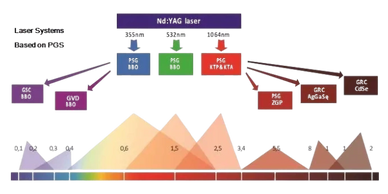 We provide laser output with fixed wavelengths or continuous tuning from 0.2 μm to 20 μm by combining advanced laser media and nonlinear crystals. Our systems are typically built using Nd:YAG lasers, Ti: Sapphire lasers, OPO with harmonic generators, and sum/difference-frequency generators based on various crystals.